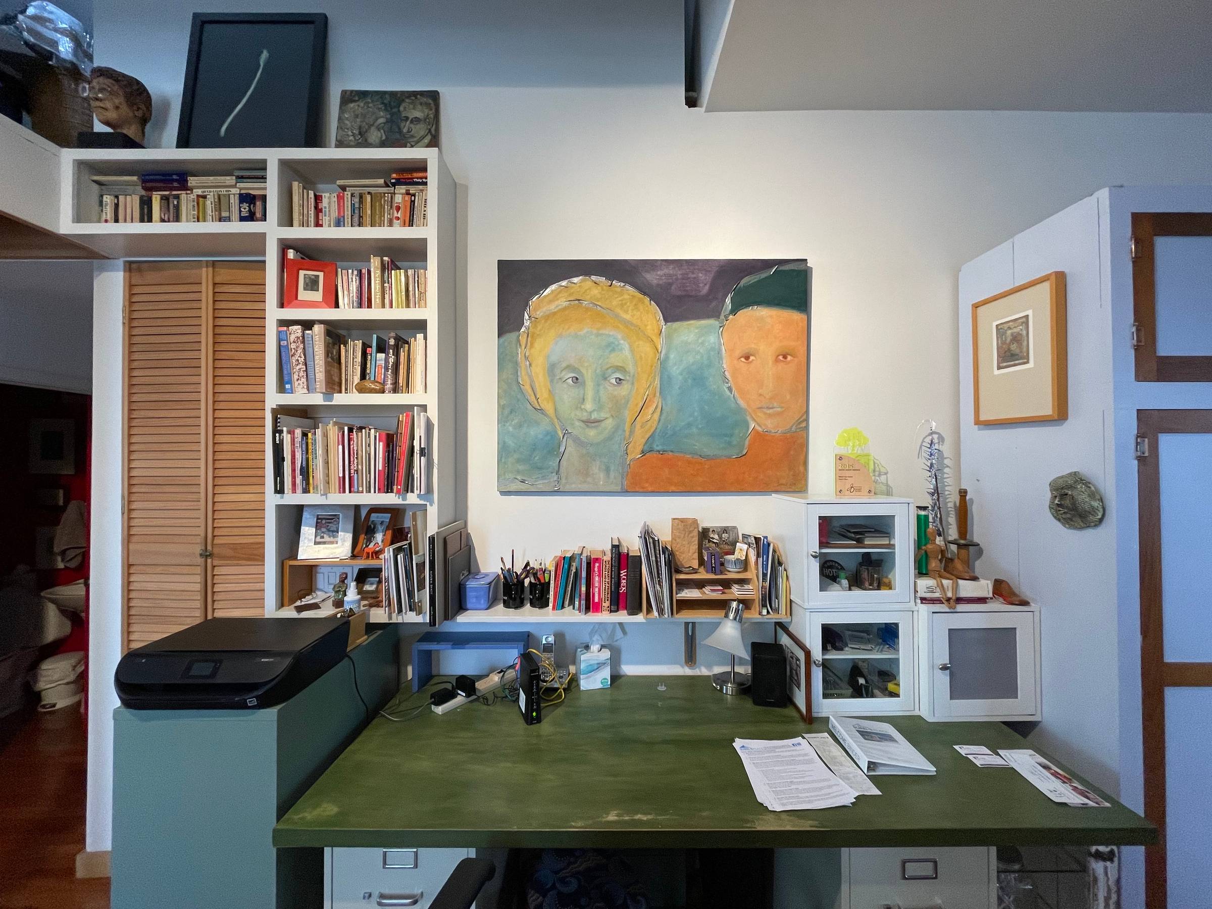 My laptop is sitting on a little wooden table tucked between a corner of windows and a floor-to-ceiling bookcase. The entire tabletop is covered in small drips, brushes, and wisps of dried paint. There is another smaller table in the immediate corner. A mannequin head wearing a painted helmet is sitting on top, looking lifelessly over the room.