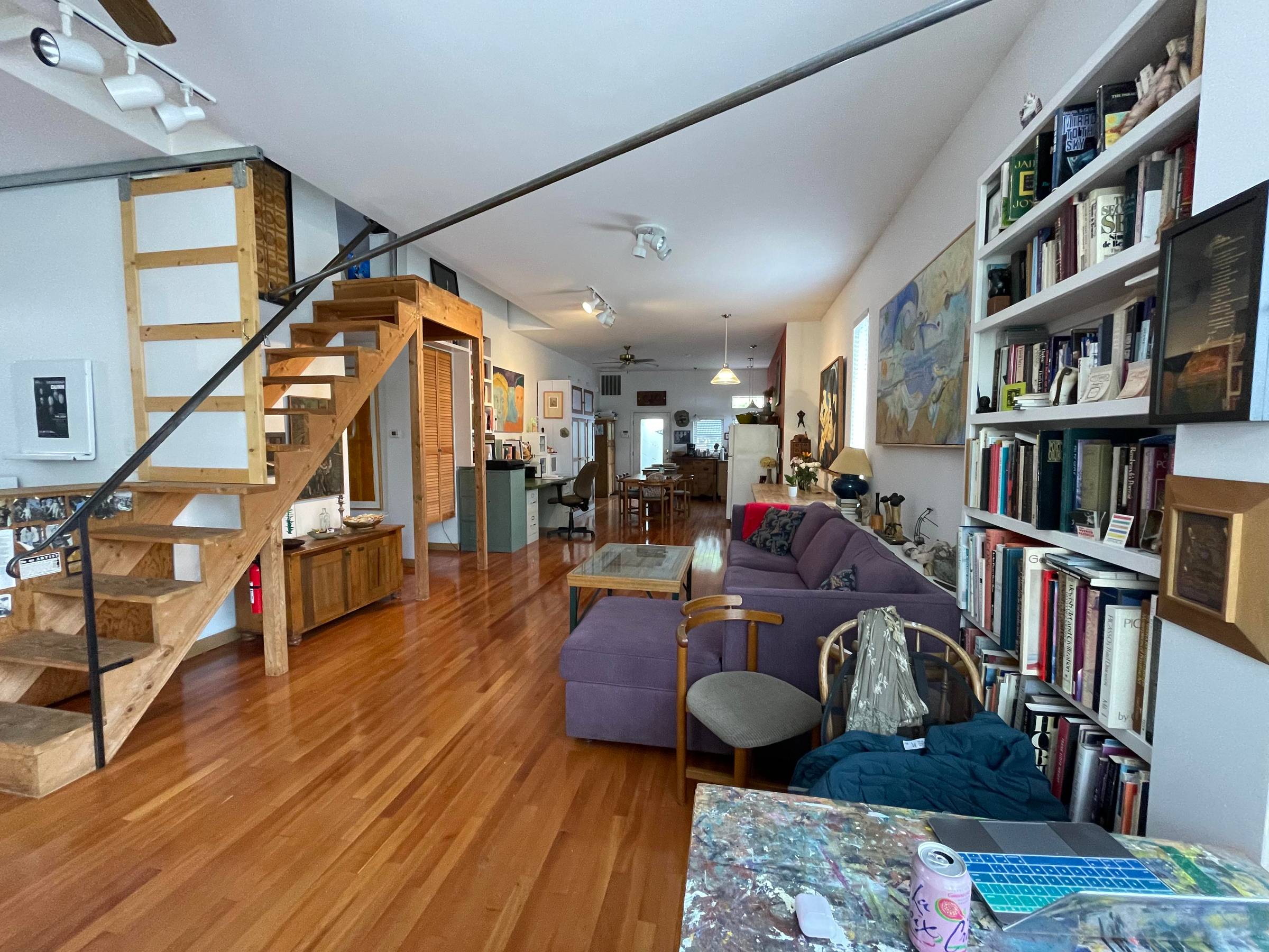 This room is essentially her entire house. It’s a long rectangle. There is hardwood floor throughout and art everywhere you look, yet it doesn’t overwhelm. The length of the house draws you in, makes you curious and comfortable enough to go deeper, stay awhile.