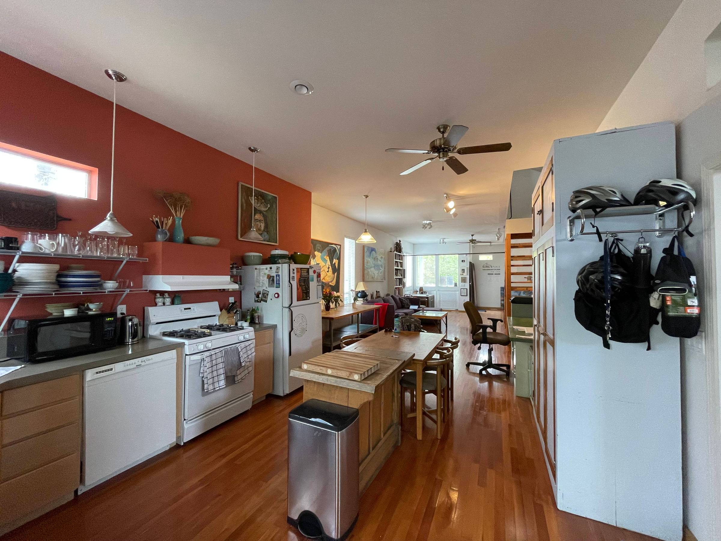 A soft purple couch, a desk, and a custom coffee table made out of an old screen print, crafted by Surel’s friend Mike Baltzell, make up the living room. My favorite room of the house is a tiny, bright red bathroom. Every wall is covered with artwork, big and small. The kitchen sits at the far end of the room, a table and a butcher block in its center. The lone bedroom is just off the kitchen, separated by French doors – one of few doors within the home.