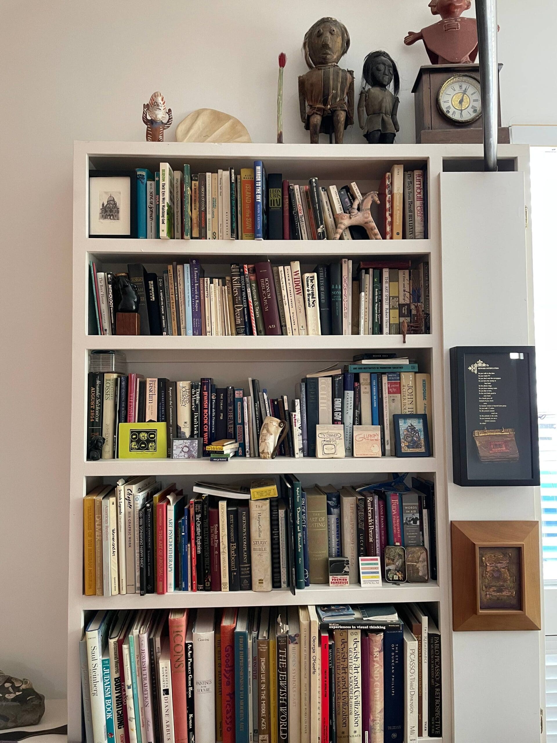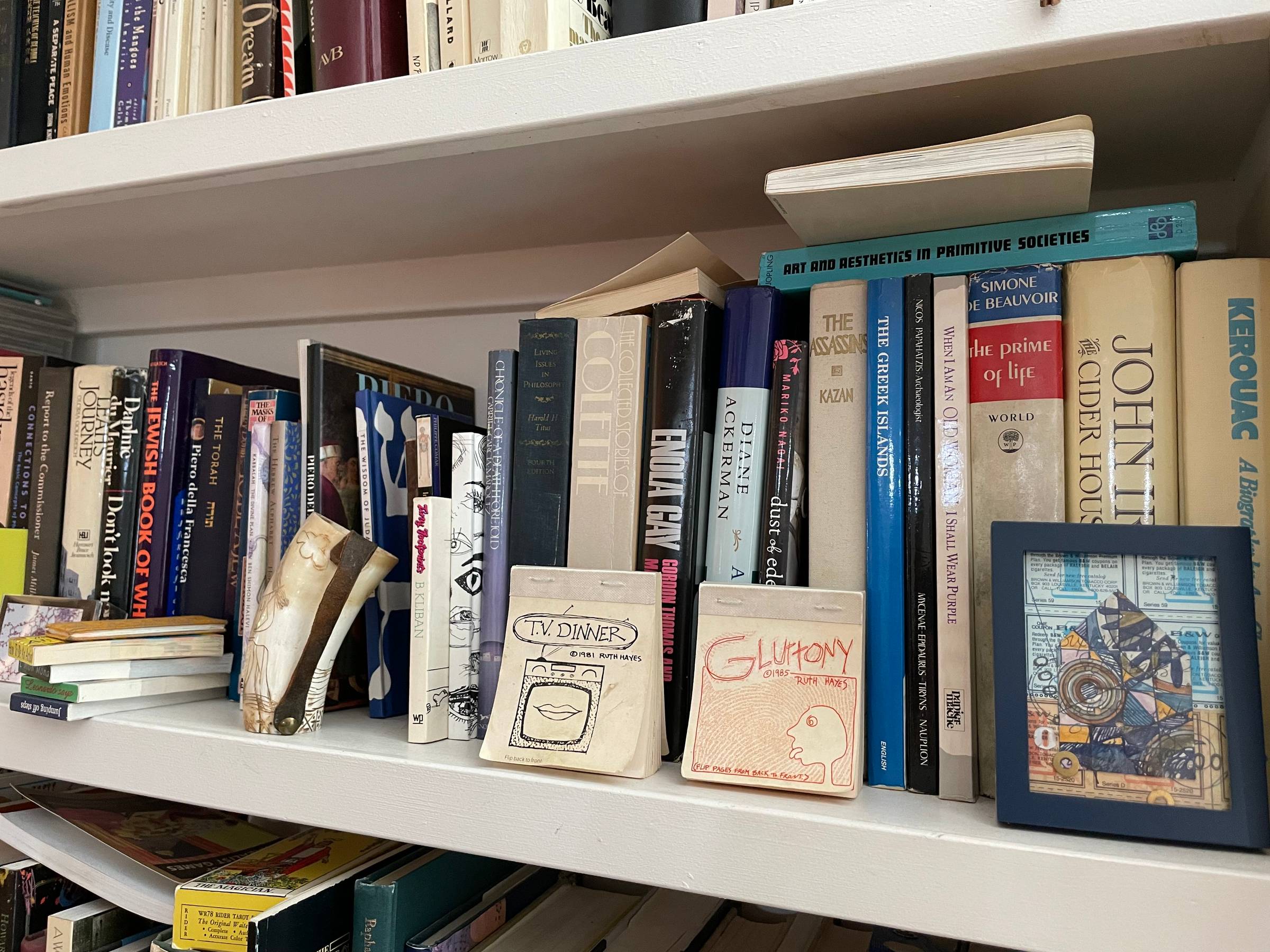 Books are not the only residents on her shelves. There’s several small flip books, a deck of tarot cards, a layered collage held in a tiny black frame, two clay pots, and a small figurine. There’s a button that reads “Art Slut”, a tiny orange wooden horse, a framed photo of Surel’s daughters, Rebecca and Stephanie, as children.