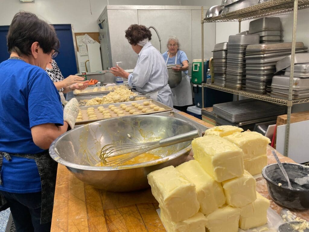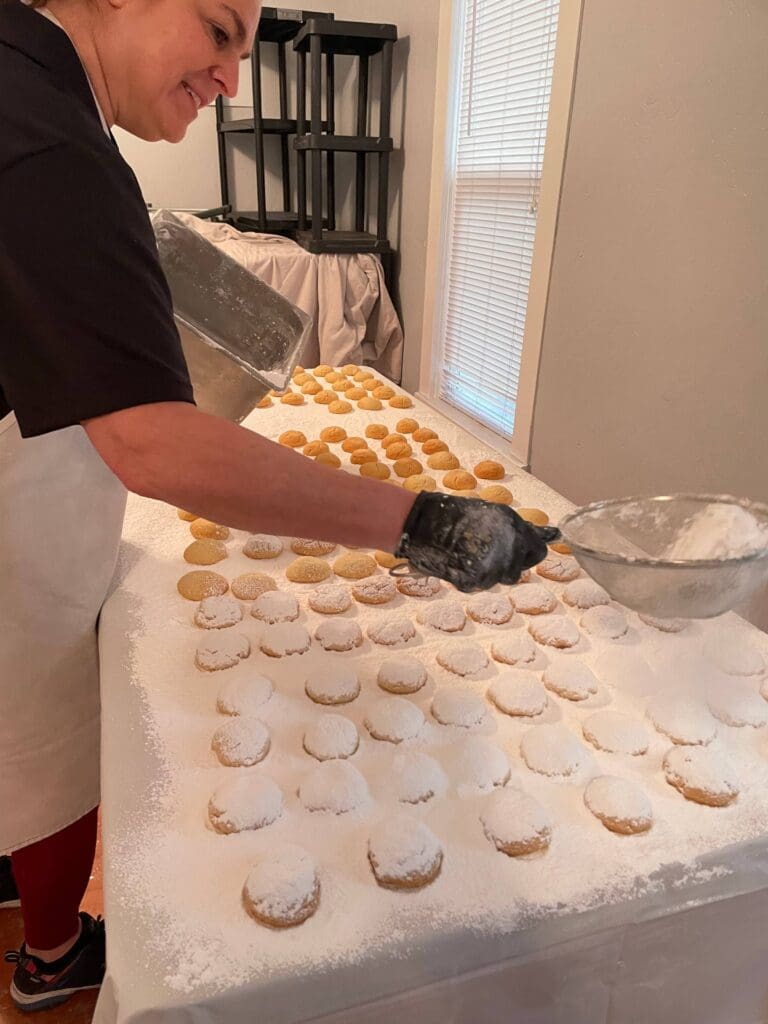 It was around 8am and six women were buzzing around the L-shaped kitchen. Two women in aprons stood on either side of a long countertop in the middle of the room, rolling dough clumps into small mounds and laying them onto a large parchment-lined baking tray, gently pressing into the soft center to leave a dimple.