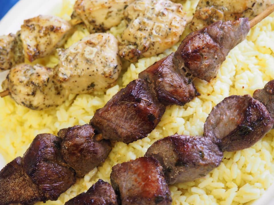 Main dishes include Souvlaki, which is marinated pork or chicken on a skewer served with Greek Pilafi, a Cretan-style rice cooked in homemade chicken broth. You can get Gryo or Falafel wrapped in pita or in a bowl, served with house-made Tzatzki sauce. You must try Pastitsio (pah-STEE-chee-oh), a traditional meal of macaroni noodles layered with seasoned meat and a white veggie sauce called Béchamel sauce.