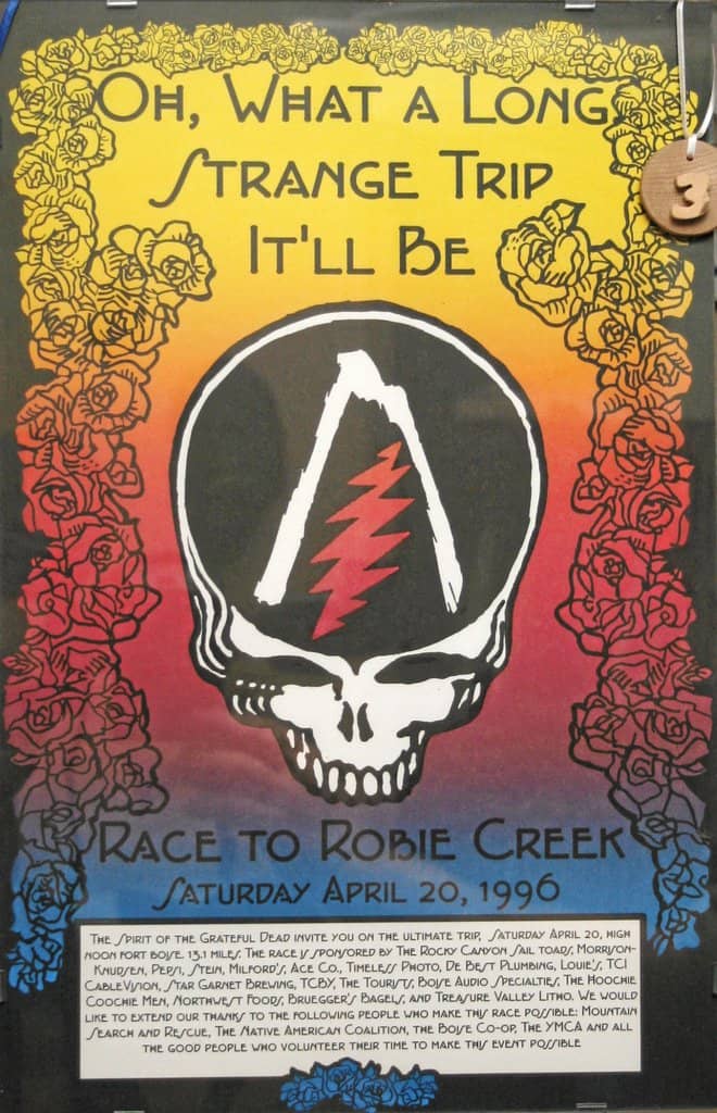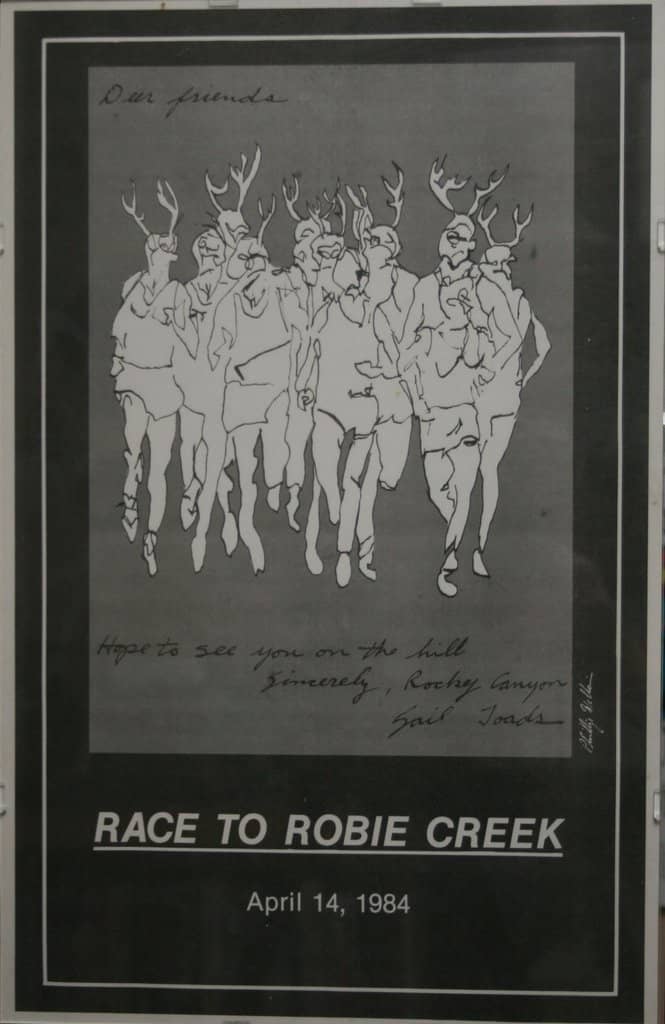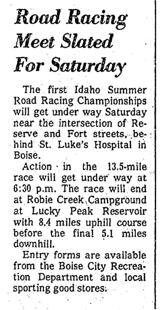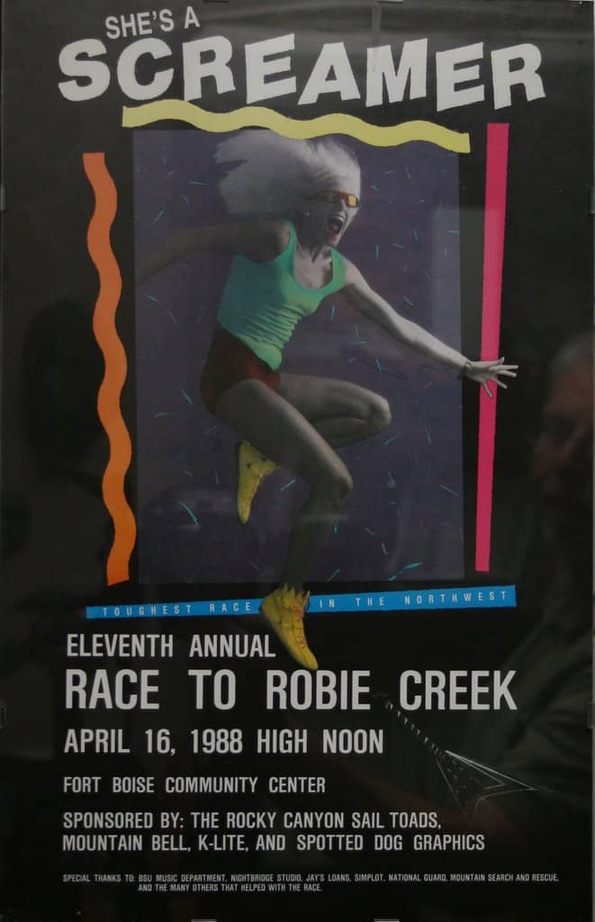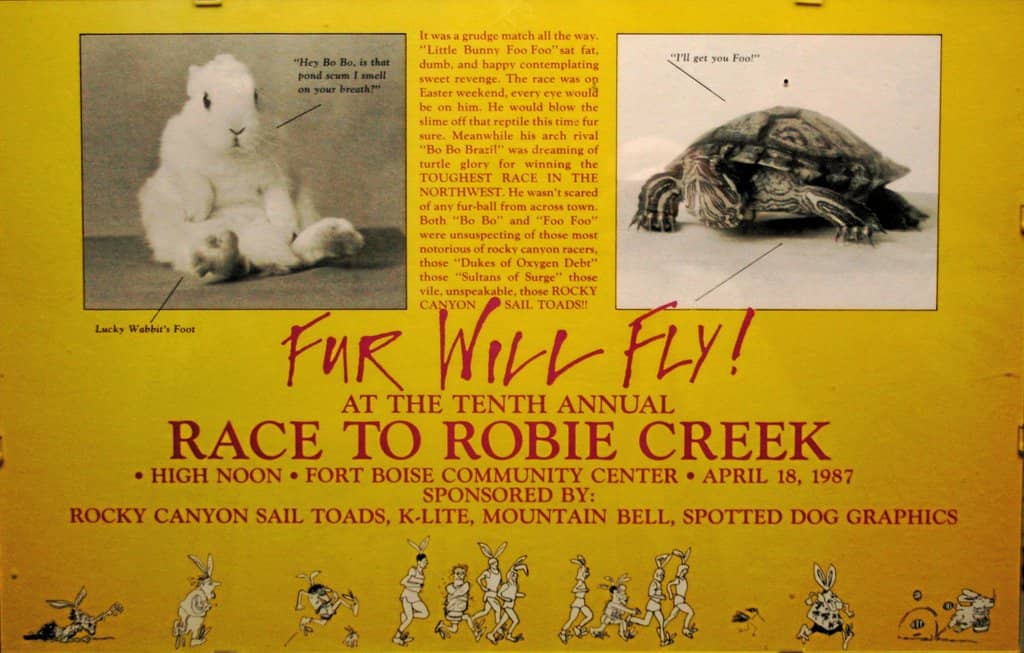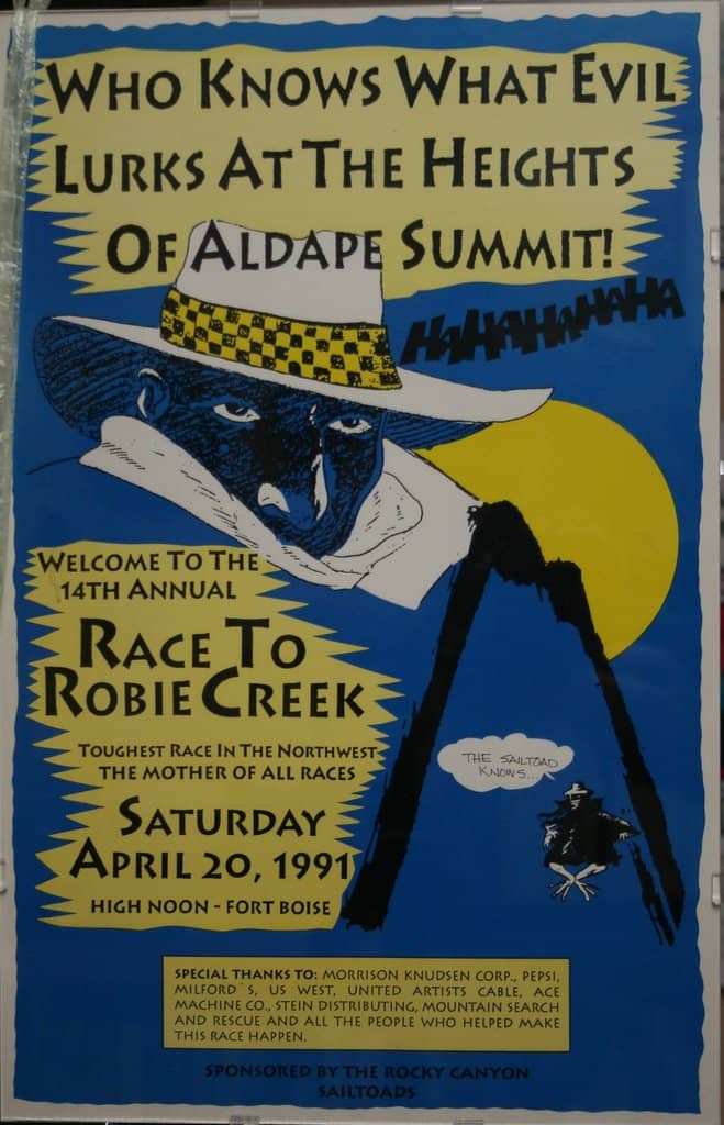 According to race organizers, the roots of the Race to Robie Creek date back to August 16, 1975. At 6:30pm, Boise runner Jon Robertson and 24 other participants of the first “Idaho Summer Road Racing Championships” took off on foot from Fort Boise. They ran up Rocky Canyon, over Aldape Summit and down to Robie Creek Campground. Don Flaten of Boise won the race in one hour, 20 minutes and Cindy Partridge of Moscow won the women’s division in 2 hours, 2 minutes. The race was the birthplace of what would eventually become the Race to Robie Creek and the Rocky Canyon Sail Toads, (which has a whole backstory of its own).