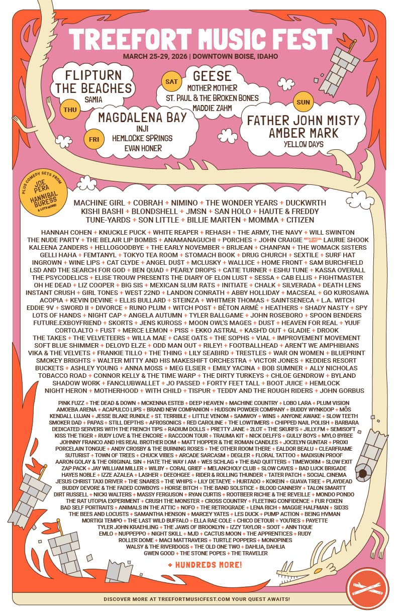 - ​Treefort Music Fest just released more of the 2026 lineup. Peep the poster below or see more here. A few artists I'm excited to see: Gelli Haha, flipturn, Liz Cooper, Cat Clyde, Brijean, The Beaches, Wine Lips. The fest is March 26-29 in downtown Boise.