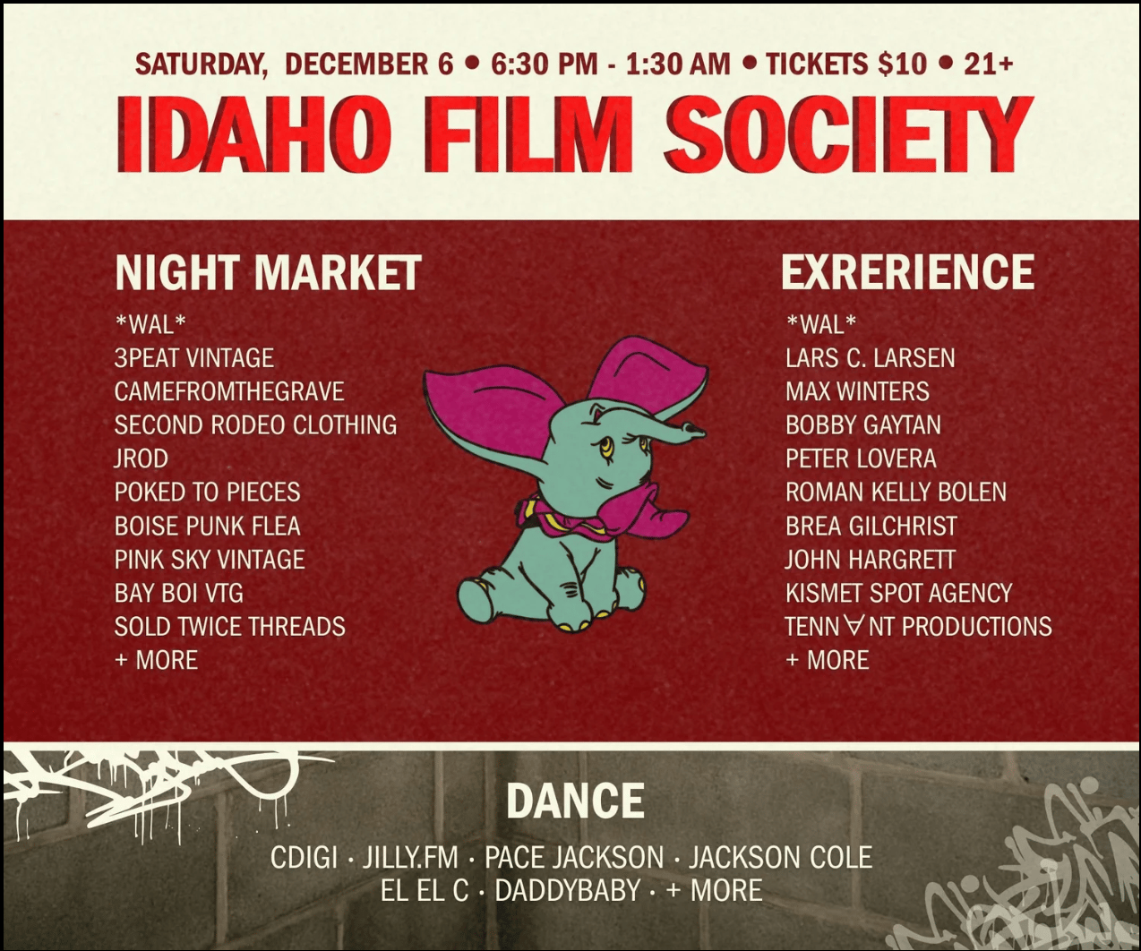 ​BNDRY Presents: An Art Show**is happening at the Idaho Film Society from 6:30–11:55pm. It’s an art show and **a dance party, night market, and interactive experience with local artists, projections, screen printing, vendors, tattoos, pizza, and DJs. Great lineup of artists and organizations on this one. Tix are $10. 21+.